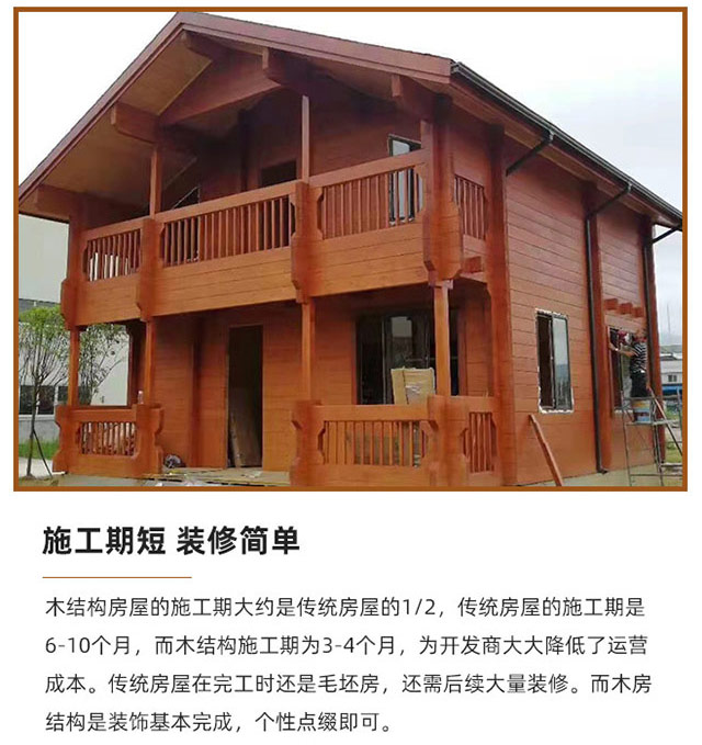 • 木結(jié)構(gòu)房屋的施工期大約是傳統(tǒng)房屋的1/2,傳統(tǒng)房屋的施工期是 6-10個(gè)月,而木結(jié)構(gòu)施工期為3-4個(gè)月,為開(kāi)發(fā)商大大降低了運(yùn)營(yíng) 成本。傳統(tǒng)房屋在完工時(shí)還是毛坯房,還需后續(xù)大量裝修。而木房 結(jié)構(gòu)是裝飾基本完成,個(gè)性點(diǎn)綴即可。